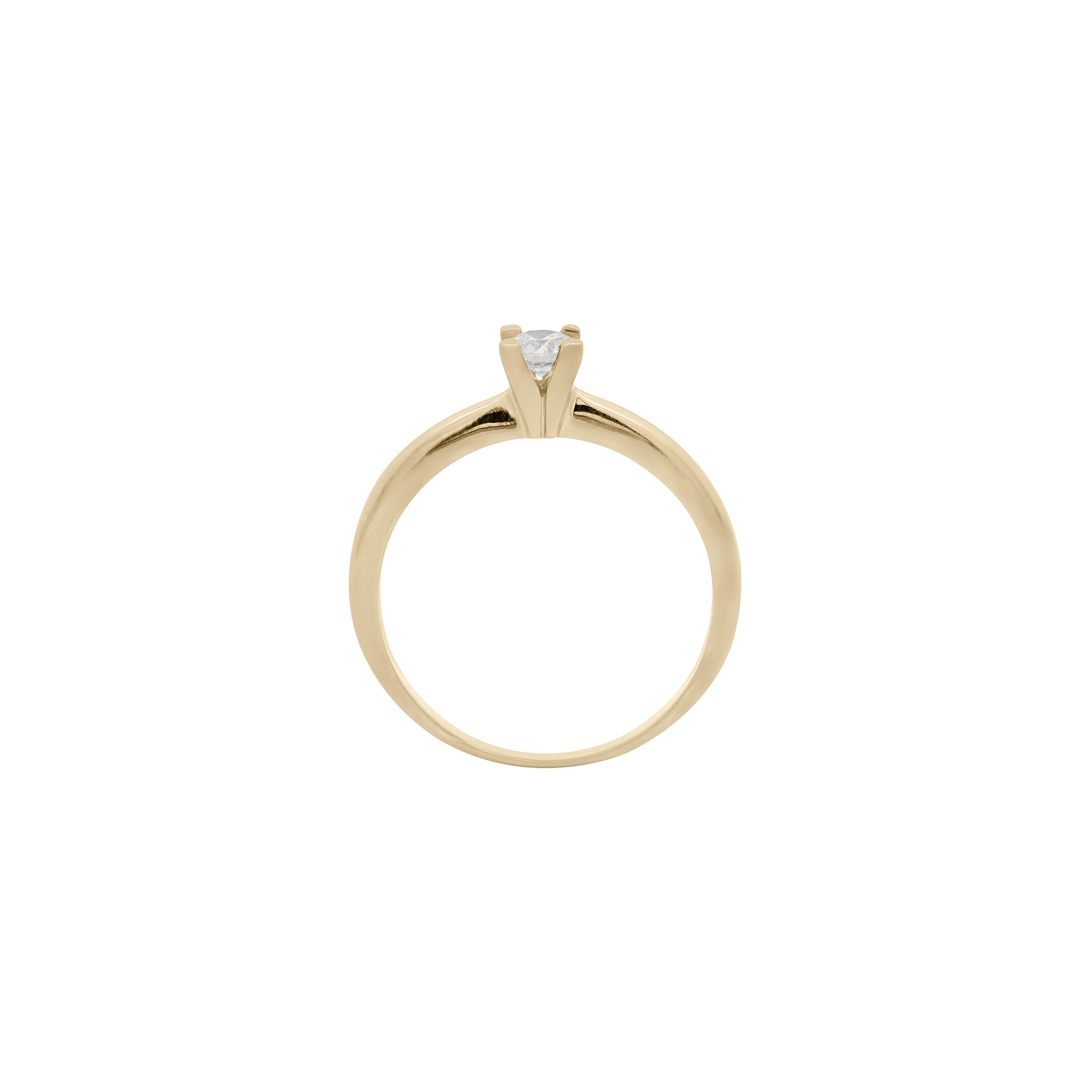 Anillo solitario en oro amarillo de 14k engastado con un diamante central de 0.20 ct. Su diseño evoca la luz dorada de un atardecer, símbolo de calidez, elegancia y el brillo constante de los momentos más memorables.