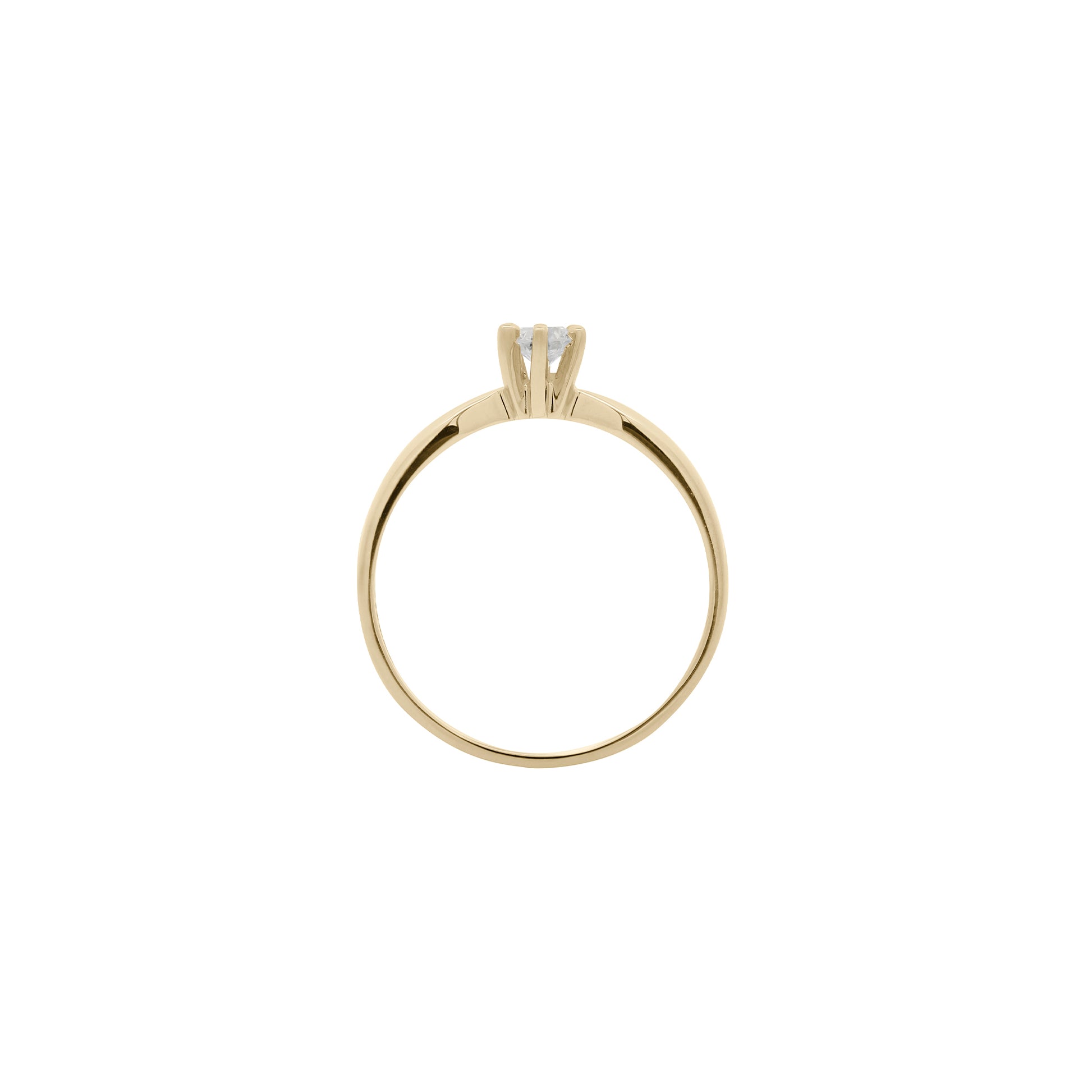 Un delicado anillo solitario en oro amarillo de 14k, realzado con un diamante central de 0.20 ct. Su diseño minimalista captura la pureza de un instante eterno, donde el resplandor del diamante se funde con la calidez del oro.