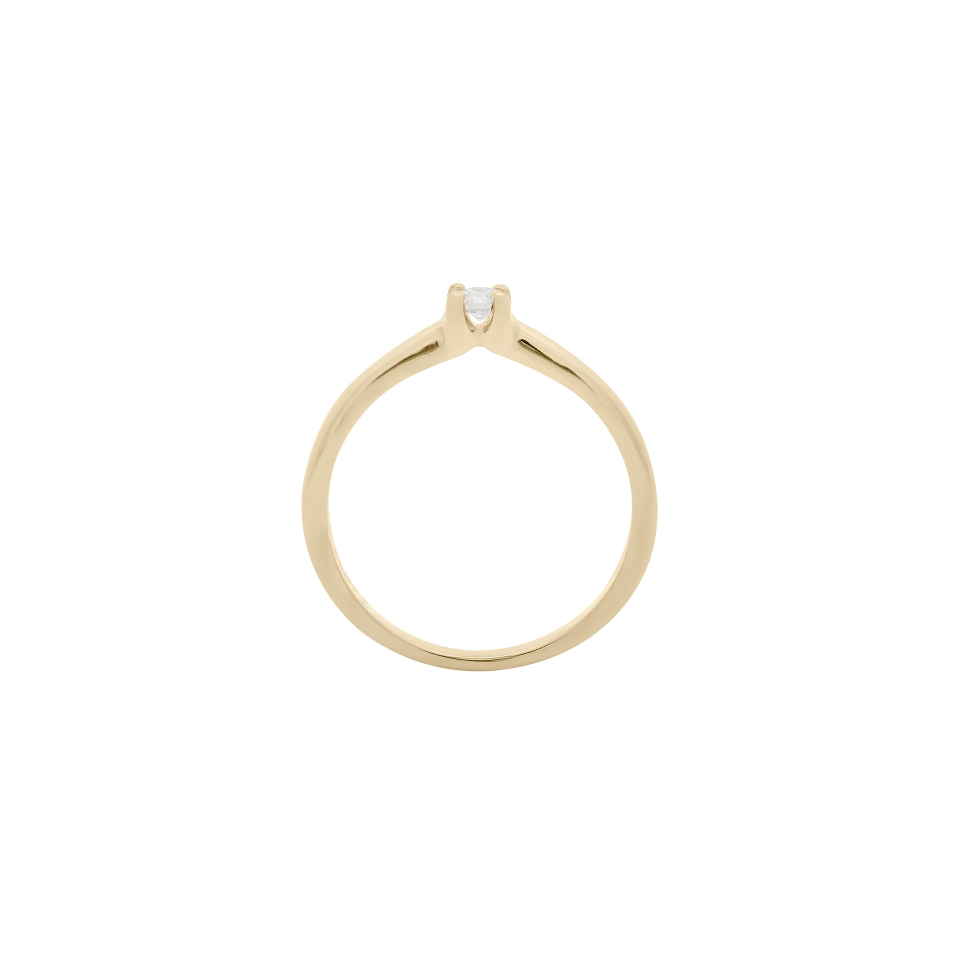 Anillo solitario en oro amarillo de 14k que enmarca un diamante central de 0.10 ct. Su diseño sutil y luminoso evoca la calidez de un rayo de sol, convirtiéndose en un símbolo delicado de amor eterno y elegancia atemporal.