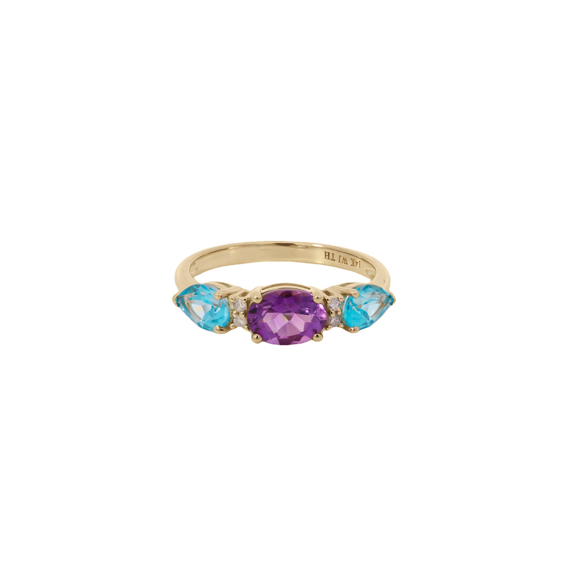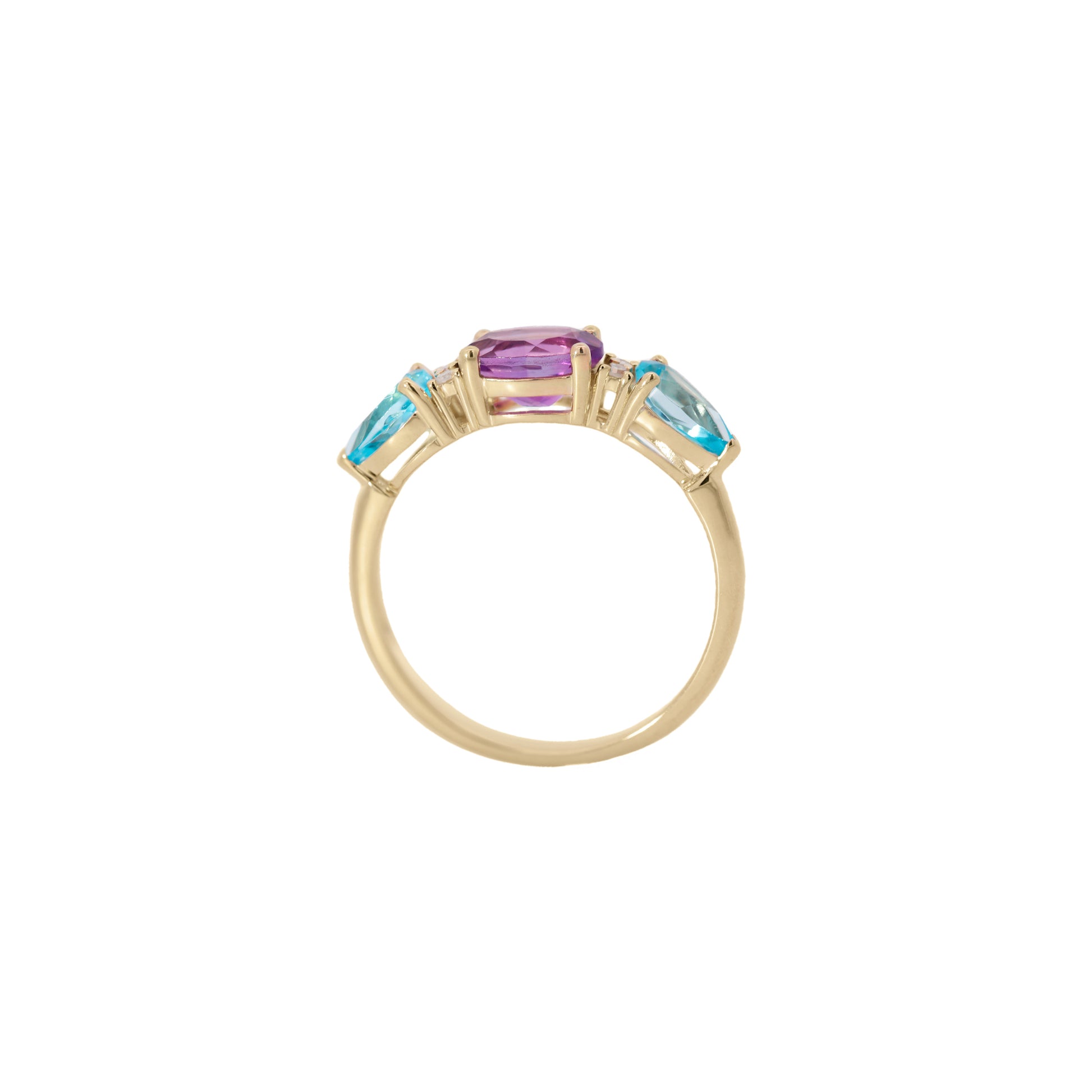 Este anillo de oro amarillo 14K presenta una amatista oval central acompañada por dos topacios azules en forma de gota. Con un peso total de 1.62 ct en gemas y 0.04 ct de diamantes naturales, su contraste de colores crea un efecto vibrante y sofisticado, ideal para quienes buscan destacar con estilo único.