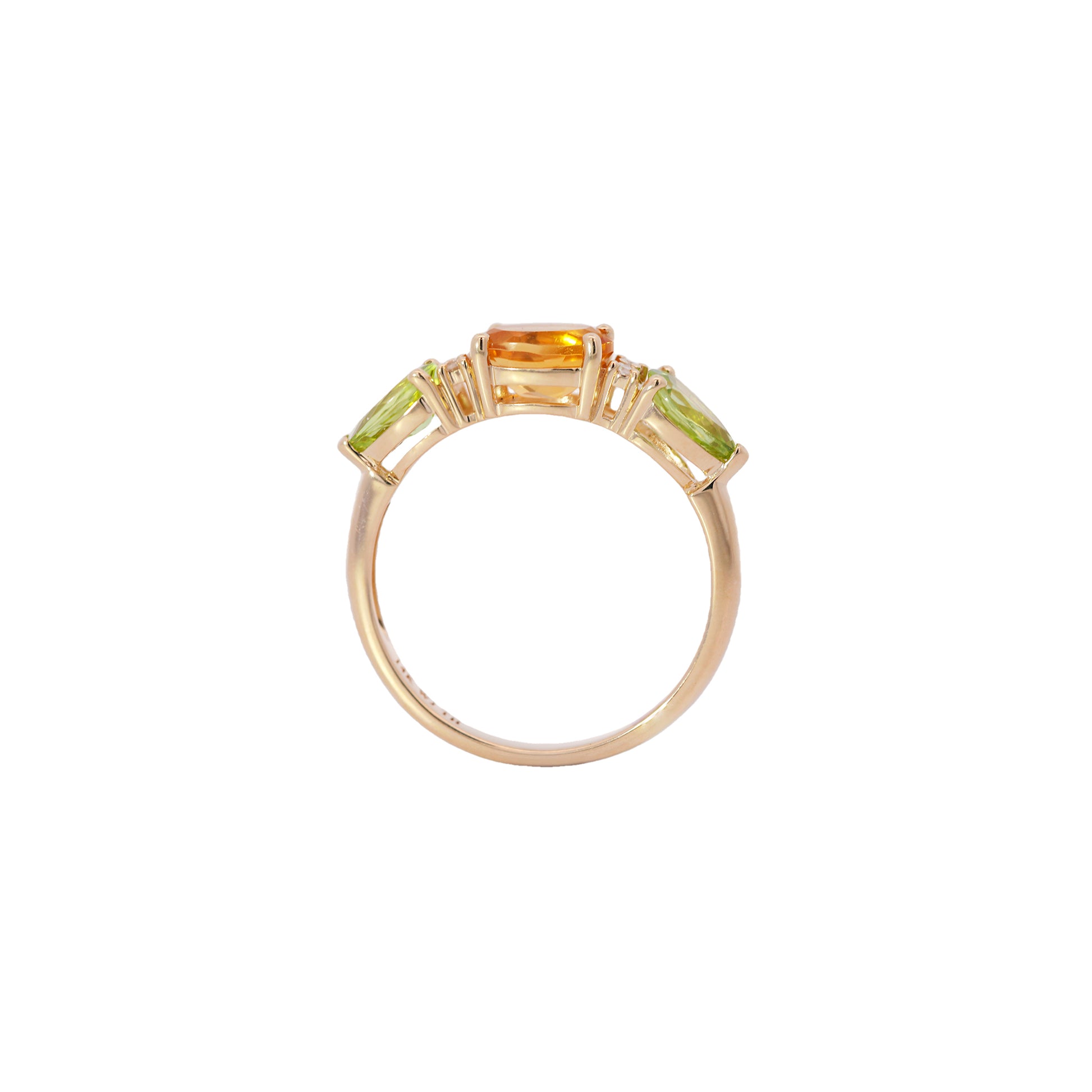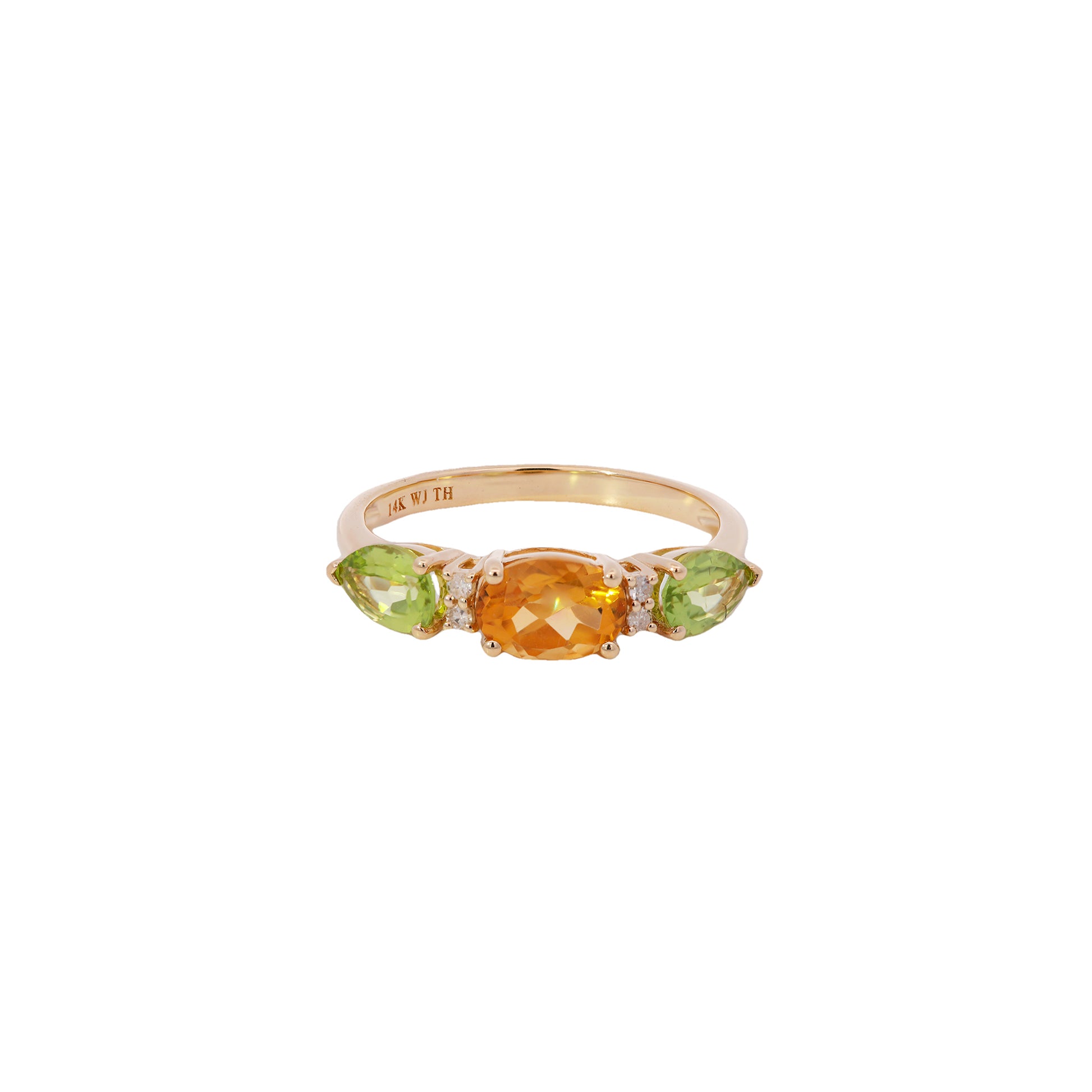 Luce un toque de color y sofisticación con este anillo de oro amarillo 14K, diseñado con una citrina oval central, acompañada por dos peridotos en forma de gota a cada lado en total las piedras tienen un peso de 1.50ct. El diseño se completa con delicados diamantes de 0.04 ct que realzan el brillo de las piedras principales, creando un conjunto armonioso y elegante.