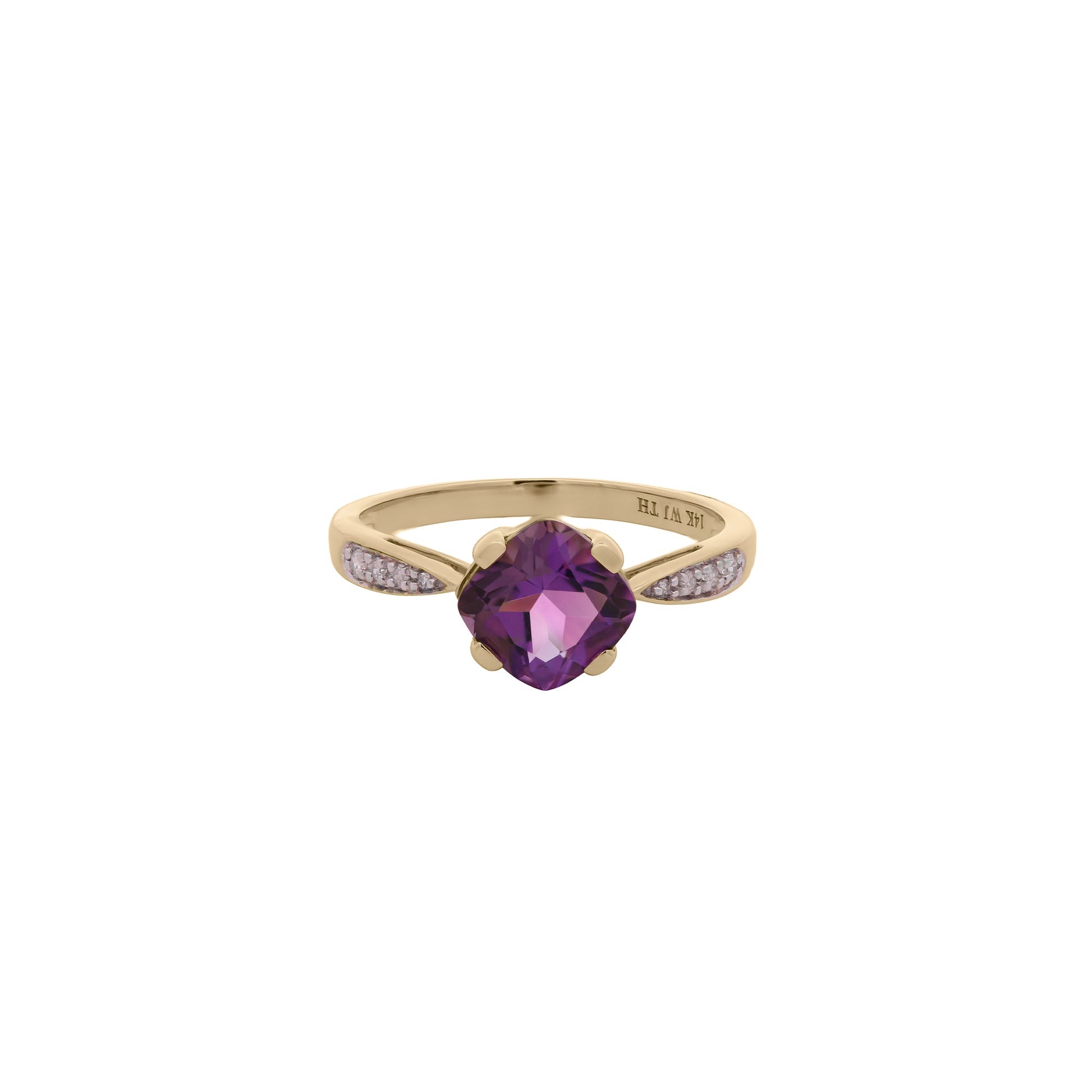 Anillo en oro amarillo de 14k combina la riqueza del metal precioso con la intensidad natural de la amatista, resaltada por diamantes adicionales con un peso total de 0.06 ct. La Amatista de 3.02 ct aporta profundidad y elegancia, mientras que el diseño equilibrado convierte a esta joya en una pieza atemporal.