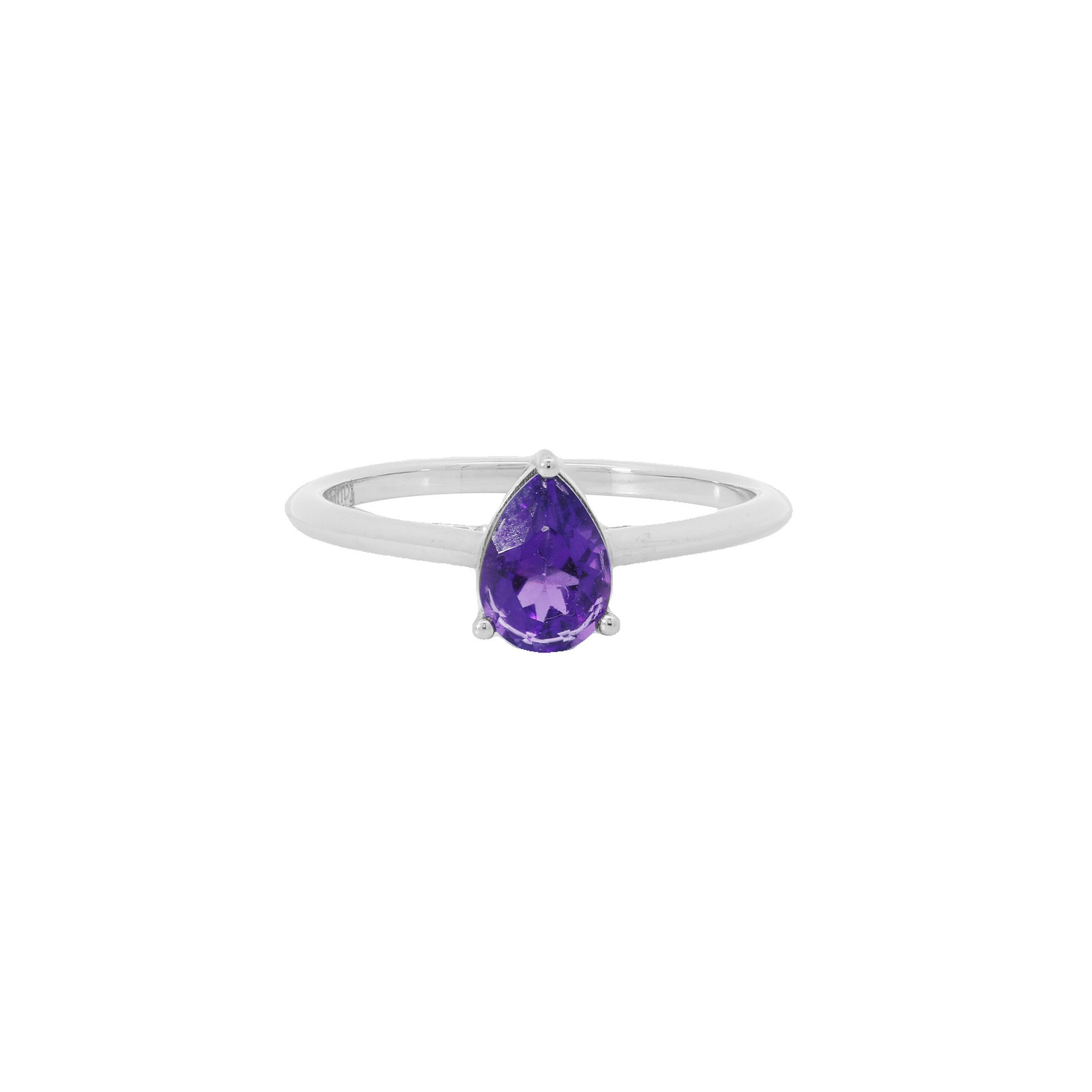 Sofisticado y femenino, este anillo solitario de oro blanco 14K resalta con una amatista en corte gota de 0.71 ct. Su diseño minimalista realza la belleza y el color intenso de la gema, creando una pieza elegante y atemporal.